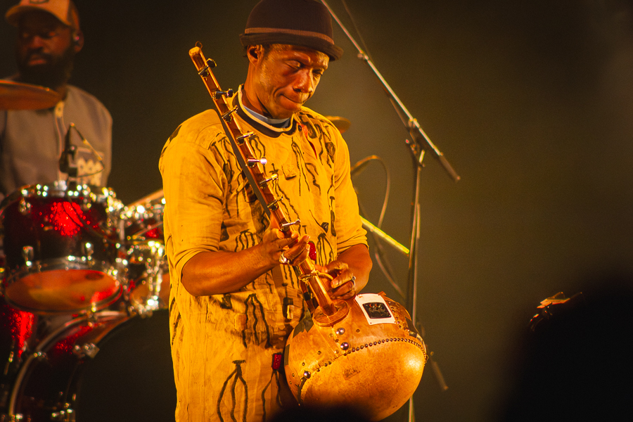 Harouna Samaké au kamale ngoni, la harpe des jeunes hommes du sud du Mali, jouait son instrument sur le dos et sur la tête sans manquer une note. Showman sans gimmick, parce que le rythme ne lâchait pas. Seydou Kouyaté, derrière son keytar, malmenait l’instrument avec l’évidence de quelqu’un qui a passé sa vie à en rêver. Ce qu’il a confirmé après le concert : il a toujours voulu un keytar. Cela s’entendait. La section rythmique — Mohamed Kouyaté à la basse, Moïse Sagara à la batterie, Daouda Koné aux djembés et congas — était soudée au point que le groove devenait irrésistible dès le deuxième morceau. Abou Cissé tenait la MPC. Neuf personnes sur scène, aucune de trop.